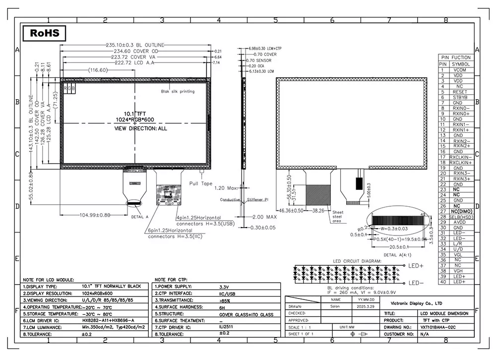 বুদ্ধিমত্তার যুগে, টিএফটি মডিউলটি আমাদের প্রয়োজনীয় ডেটা দৃশ্যত উপস্থাপন করতে সক্ষম করে। টিএফটি মডিউলটির গুণমানটি এর প্রয়োগের উপর একটি গুরুত্বপূর্ণ প্রভাব ফেলে। সিটিপি সহ ভিক্ট্রোনিক্স 10.1 ইঞ্চি 1024 × 600 এলভিডিএস টিএফটি মডিউলটির সুবিধা কী? প্রথমদিকে, এর 420 সিডি/এম² উজ্জ্বলতা, 800: 1 কনট্রাস্ট অনুপাত, সমস্ত দিকের একটি 80-ডিগ্রি দেখার কোণ এবং 75% অভিন্নতা স্পষ্ট চিত্র নিশ্চিত করে। দ্বিতীয়ত, এটি HX8282A11+HX8696A নিয়ামক এবং ILI2511 সিটিপি কন্ট্রোলারের সাথে একটি শক্তিশালী 5-পয়েন্ট ক্যাপাসিটিভ টাচ প্যানেল সহ একটি 6/8-বিট এলভিডিএস ইন্টারফেসকে সমর্থন করে। অতিরিক্তভাবে, এটিতে 30,000 থেকে 50,000 ঘন্টা জীবনকাল সহ একটি 3 × 13-নেতৃত্বাধীন সাদা ব্যাকলাইট রয়েছে, যা বিভিন্ন শিল্প অ্যাপ্লিকেশনগুলিতে তার দীর্ঘমেয়াদী ব্যবহারযোগ্যতা নিশ্চিত করে। তদতিরিক্ত, এটি আরওএইচএস স্ট্যান্ডার্ডগুলির সাথে সম্মতি দেয় এবং তাপীয় শক, আর্দ্রতা এবং 8 কেভি বায়ু এবং 4 কেভি যোগাযোগ পর্যন্ত ইএসডি সুরক্ষা সহ কঠোর নির্ভরযোগ্যতা পরীক্ষাগুলি সফলভাবে পাস করে। এই পণ্যটি -20 ডিগ্রি সেন্টিগ্রেড থেকে +70 ডিগ্রি সেন্টিগ্রেড পর্যন্ত চরম তাপমাত্রায় দক্ষতার সাথে কাজ করে এবং -30 ডিগ্রি সেন্টিগ্রেড থেকে +80 ডিগ্রি সেন্টিগ্রেড থেকে গুরুতর স্টোরেজ শর্তগুলি সহ্য করতে পারে।