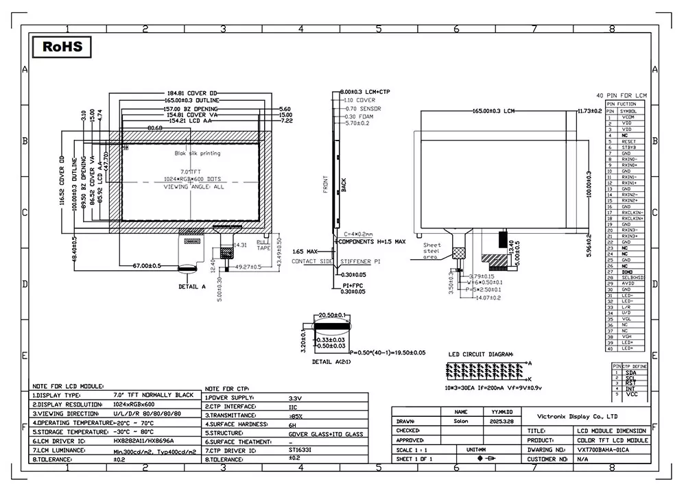 বুদ্ধিমত্তার যুগে, টিএফটি মডিউলটি আমাদের প্রয়োজনীয় ডেটা দৃশ্যত উপস্থাপন করতে সক্ষম করে। টিএফটি মডিউলটির গুণমানটি এর প্রয়োগের উপর একটি গুরুত্বপূর্ণ প্রভাব ফেলে। ভিক্ট্রোনিক্স 7 ইঞ্চি 1024 × 600 এলভিডিএস আইপিএস টিএফটি এলসিডি এর সুবিধাগুলি কী? প্রথমদিকে, এর 420 সিডি/এম² উজ্জ্বলতা, 800: 1 কনট্রাস্ট অনুপাত, সমস্ত দিকের একটি 80-ডিগ্রি দেখার কোণ এবং 75% অভিন্নতা স্পষ্ট চিত্র নিশ্চিত করে। দ্বিতীয়ত, এটি HX8282A11/HX8696A কন্ট্রোলার, একটি ক্যাপাসিটিভ টাচ প্যানেল এসটি 1633 আই কন্ট্রোলার এবং 3 × 10 সাদা এলইডি ব্যাকলাইট সহ 30,000 থেকে 50,000 ঘন্টা আজীবন সহ একটি 3 × 10 সাদা এলইডি ব্যাকলাইট সমর্থন করে, বিভিন্ন শিল্প অ্যাপ্লিকেশনগুলিতে তার দীর্ঘমেয়াদী ব্যবহারযোগ্যতা নিশ্চিত করে। এছাড়াও, এটি আরওএইচএস স্ট্যান্ডার্ডগুলির সাথে মেনে চলে এবং তাপীয় শক, আর্দ্রতা এবং 8 কেভি বায়ু এবং 4 কেভি যোগাযোগ পর্যন্ত ইএসডি সুরক্ষা সহ কঠোর নির্ভরযোগ্যতা পরীক্ষাগুলি সফলভাবে পাস করে। এই পণ্যটি -20 ডিগ্রি সেন্টিগ্রেড থেকে +70 ডিগ্রি সেন্টিগ্রেড পর্যন্ত চরম তাপমাত্রায় দক্ষতার সাথে কাজ করে।