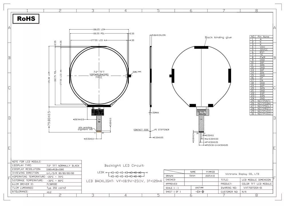 টিএফটি মডিউল জীবনের সর্বত্র পাওয়া যাবে। এই ভিক্ট্রোনিক্স 7 ইঞ্চি 1080 × 1080 রাউন্ড আইপিএস টিএফটি এলসিডি অন্যান্য নির্মাতাদের থেকে আলাদা করে তোলে? প্রথমদিকে, এর 500 সিডি/এম² উজ্জ্বলতা, 800: 1 কনট্রাস্ট অনুপাত এবং সমস্ত দিকগুলিতে 80 of এর কোণগুলি দেখার জন্য স্পষ্ট চিত্রগুলি নিশ্চিত করে। দ্বিতীয়ত, ডিভাইসটি উচ্চ-গতির ডেটা স্থানান্তরের জন্য FL5893DC নিয়ামক সহ একটি 4-লেনের এমআইপিআই ইন্টারফেস সমর্থন করে। অতিরিক্তভাবে, এটিতে বিভিন্ন শিল্প অ্যাপ্লিকেশনগুলিতে নির্ভরযোগ্য পারফরম্যান্স নিশ্চিত করে 30,000 থেকে 50,000 ঘন্টা জীবনকাল সহ 32 টি সাদা এলইডি ব্যাকলাইট রয়েছে। এছাড়াও, এটি আরওএইচএস স্ট্যান্ডার্ডগুলি পূরণ করে এবং চরম তাপমাত্রায় (-20 ডিগ্রি সেন্টিগ্রেড থেকে +70 ডিগ্রি সেন্টিগ্রেড) নির্দোষভাবে পরিচালনা করতে কঠোর নির্ভরযোগ্যতা পরীক্ষাগুলি (তাপীয় শক, আর্দ্রতা, স্টোরেজ) পাস করে এবং কঠোর স্টোরেজ শর্তগুলি (-30 ° C থেকে +80 ° C) সহ্য করে।